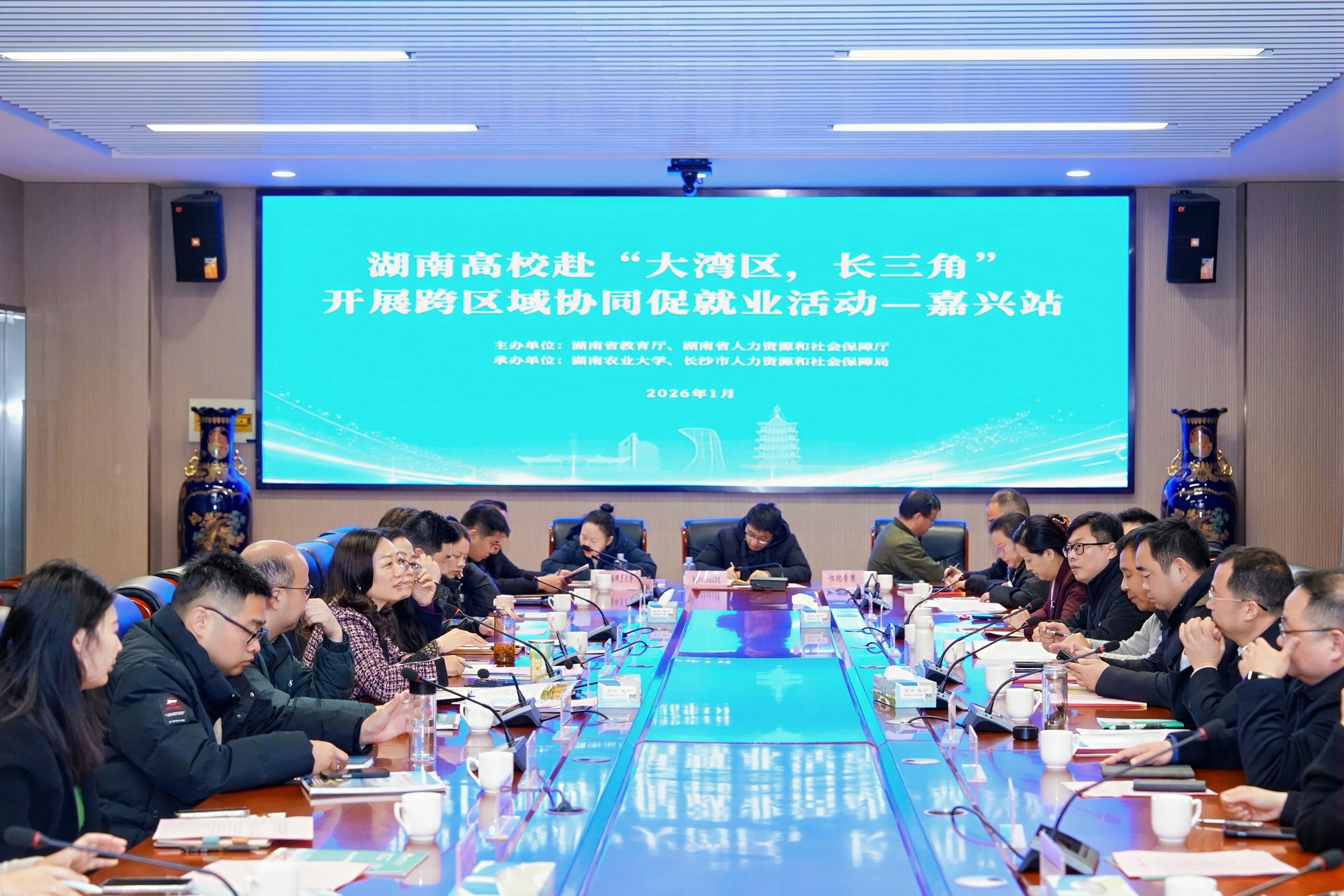 调研团先后与嘉兴市、嘉善县人社局召开专题座谈会。两地人社部门详细介绍了地方发展规划、就业创业扶持政策及校企合作机制,企业代表现场发布 2026 年度招聘计划。湖南各高校结合办学特色,推介专业布局与毕业生资源,双方围绕人才培养适配、实习基地共建、校园招聘落地等议题深入磋商。