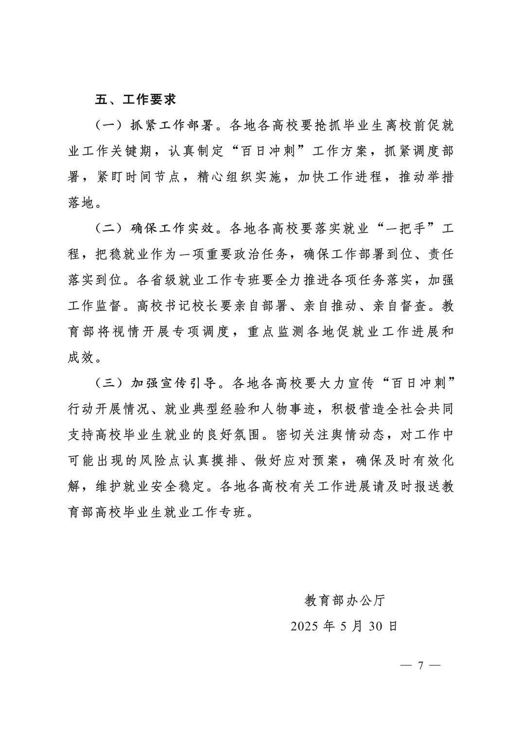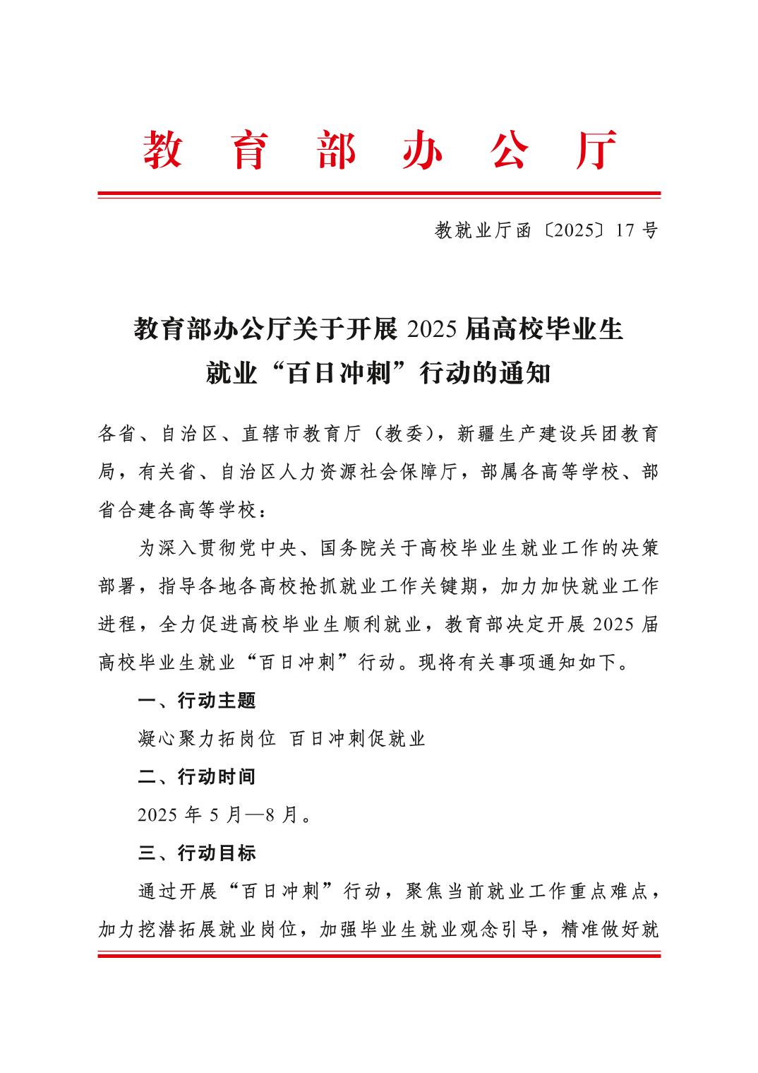 教育部办公厅关于开展2025届高校毕业生就业“百日冲刺”行动的通知